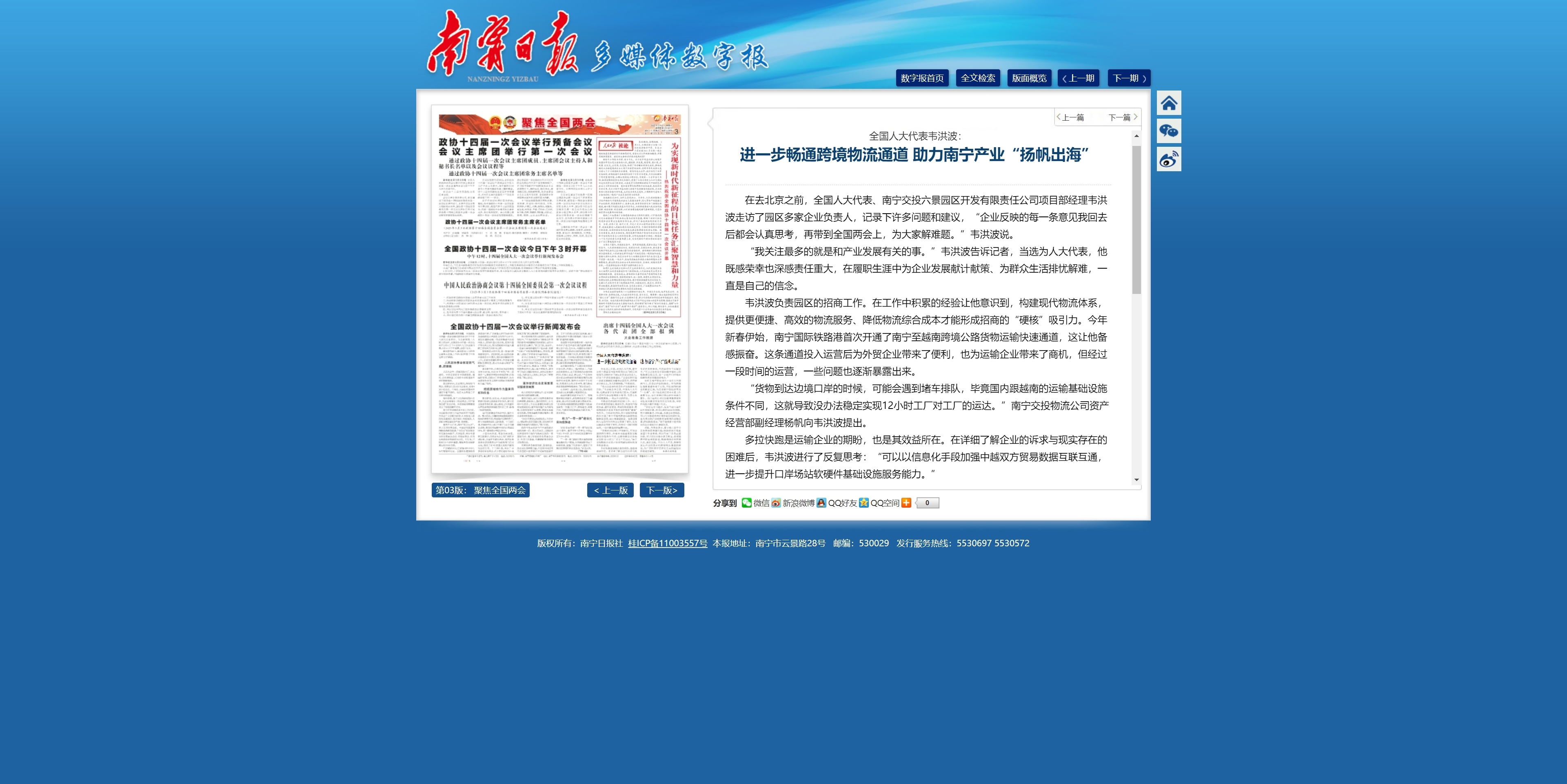 全國(guó)人大代表韋洪波:進(jìn)一步暢通跨境物流通道 助力南寧產(chǎn)業(yè)“揚(yáng)帆出?!?/h3>